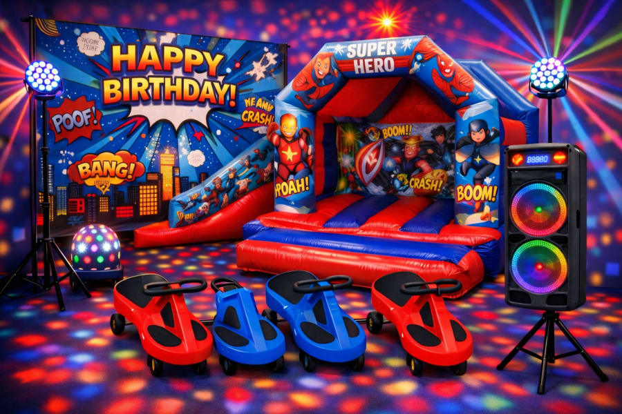For bouncy castle hire near me in Beeston, our Super Heroes Party Package delivers excitement, colour and fun.