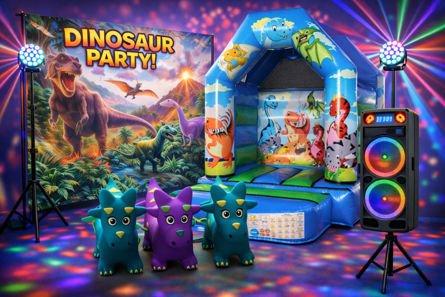 Perfect for toddlers and indoor birthday fun. We offer party package hire Small Dinosaur Bouncy Castle Party Package in Derby, Nottingham, Castle Donington, Ruddington, Belper, East Midlands, Burton, Ripley, Ashbourne, Uttoxeter, Swadlincote, Ilkeston, Heanor. This compact dinosaur party set delivers big smiles. It’s ideal for dinosaur themed birthday party planners, nurseries, and indoor party venues. πŸŽ‰πŸ¦•